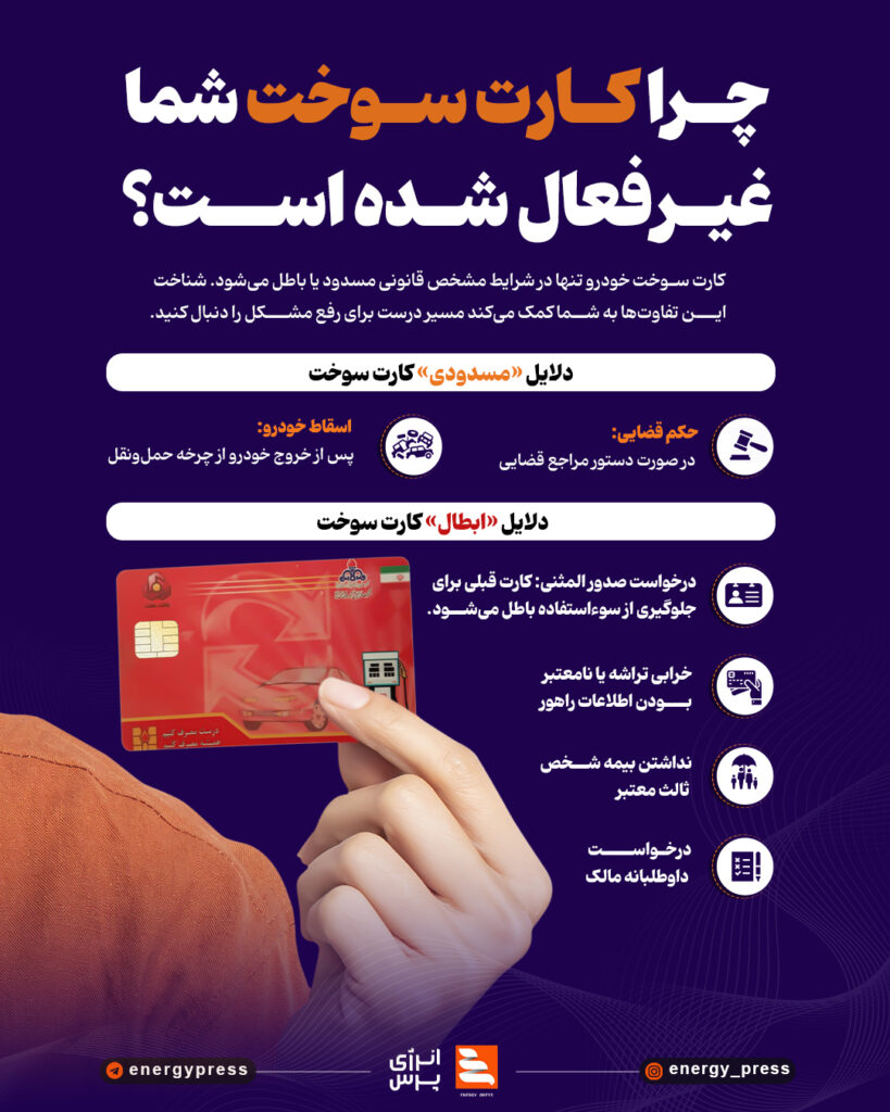 این کارت که برای سوختگیری خودروهای شخصی و عمومی مورد استفاده قرار میگیرد، تحت شرایطی مانند حکم قضایی، اسقاط خودرو یا درخواست مالک برای صدور کارت المثنی غیرفعال میشود. تمایز میان «مسدودی» و «ابطال» کارت اهمیت زیادی دارد، زیرا مسیر رفع مشکل و صدور کارت جدید در هر حالت متفاوت است.